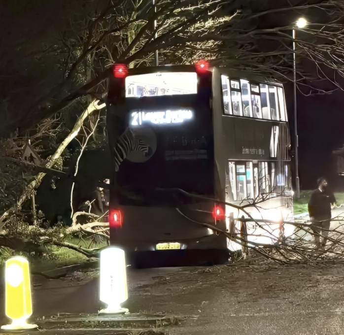 A mighty gust swept through Rushey Way, Lower Earley, Wokingham, Berkshire, yesterday – blowing a tree straight onto a passing bus!