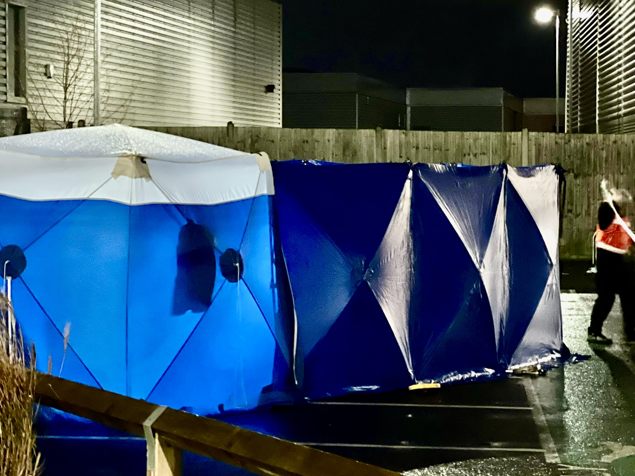 A blue and white forensic tent has been erected in the car park, while a large police cordon remains in place as investigators carry out detailed examinations. Officers have also been seen speaking with potential witnesses and reviewing CCTV footage from surrounding businesses.