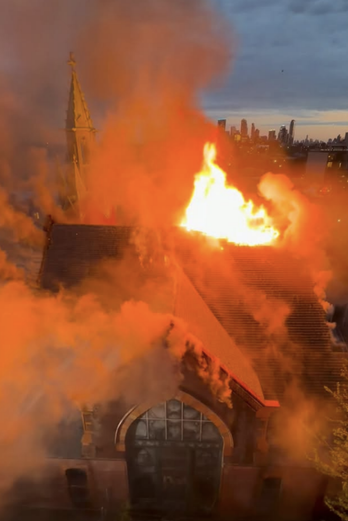 The New York Fire Department received the emergency call at 6.46pm near 12th Street between 27th and Main Avenue, close to the historic church. Within just over an hour, the fire was upgraded to a fifth alarm—the FDNY’s highest routine alert for major structural fires—mobilising 84 units and about 270 personnel.
