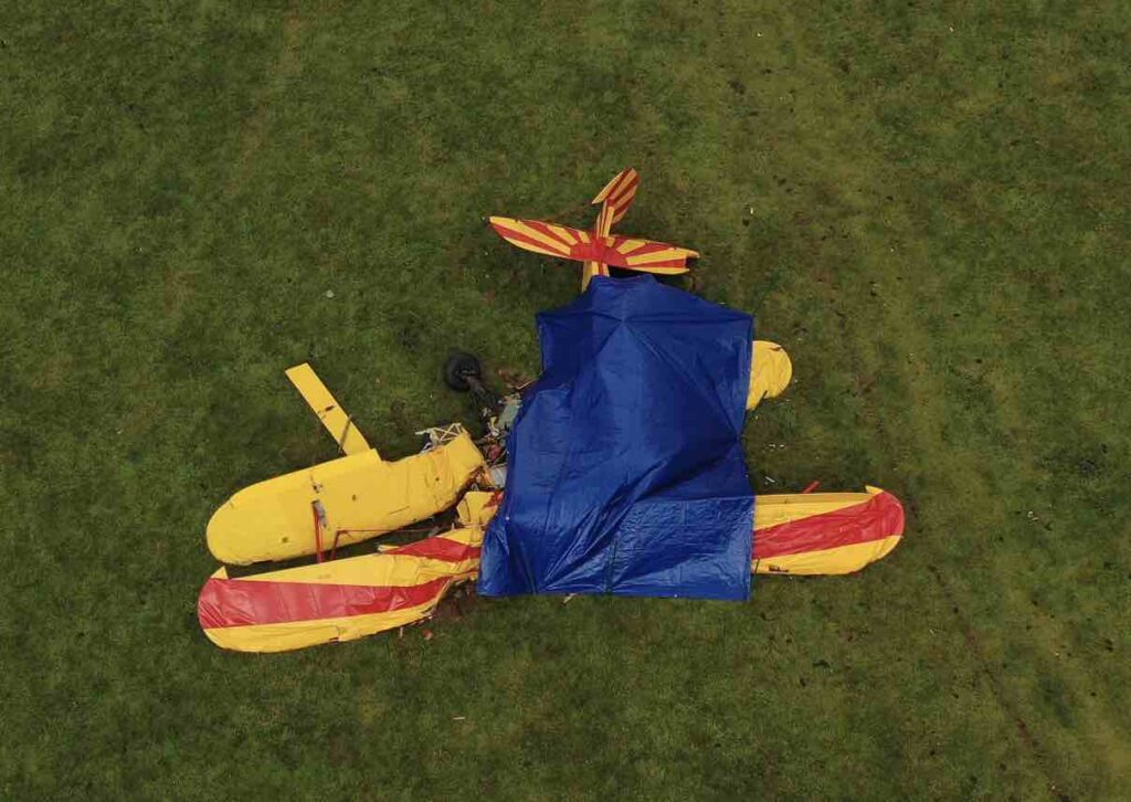 Angus, known locally as a skilled flyer, was performing a stunt with three other bi-planes from the Stampe Formation Flying Display team. Witnesses reported the plane executing a “stall turn” before it lost control and smashed behind trees near the aerodrome.
