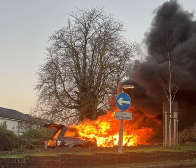 Kent Fire and Rescue Service rushed to a car fire on James Whatman Way, Maidstone, after reports of flames emerging from a vehicle.