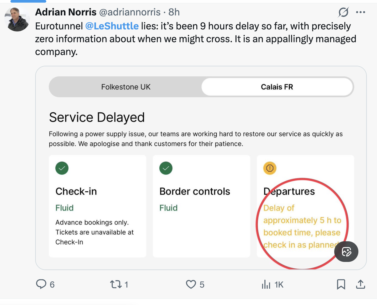 - A passenger on the 6.04pm London to Lille service described boarding at 7pm but only departing at 9pm.