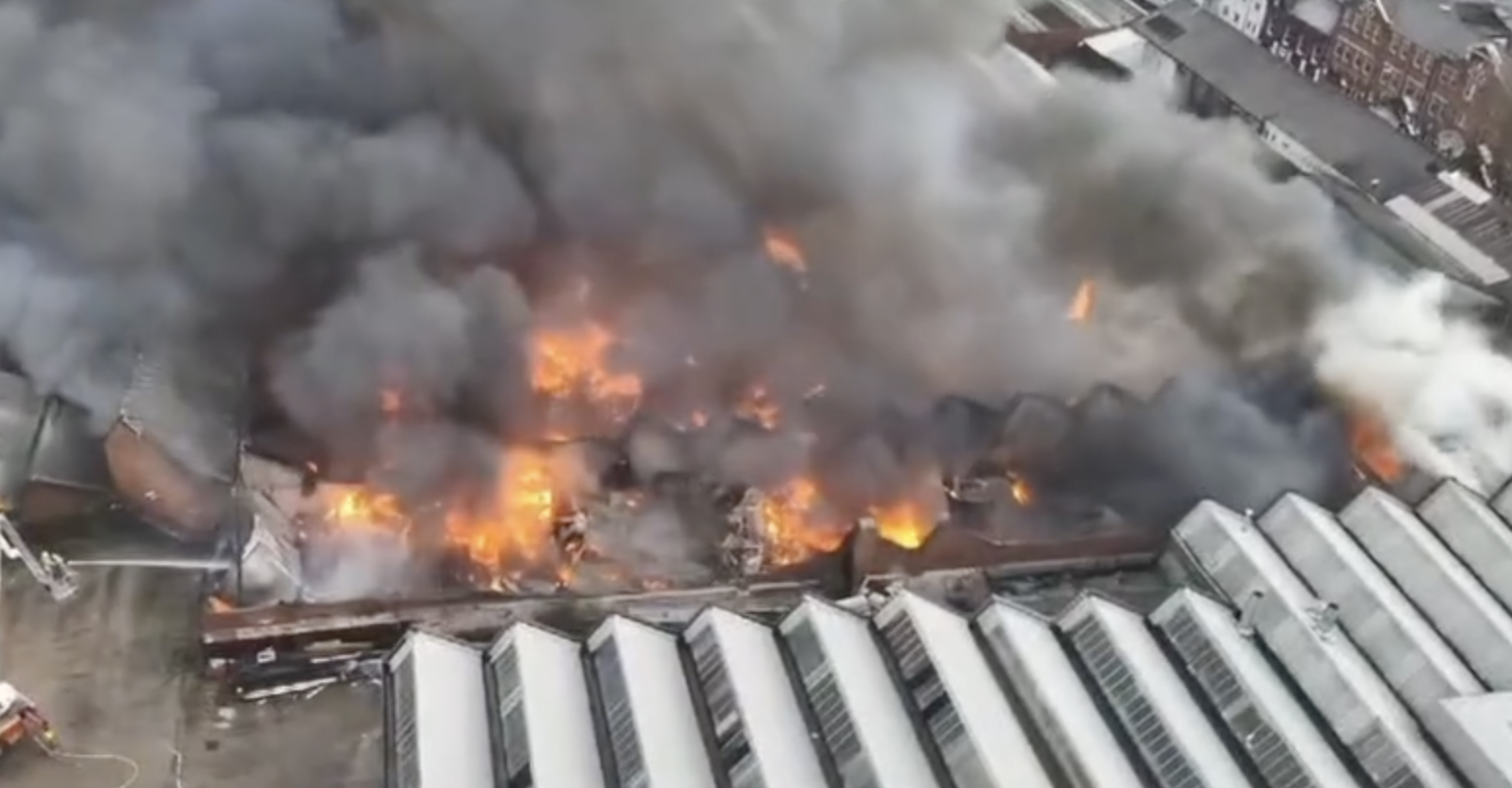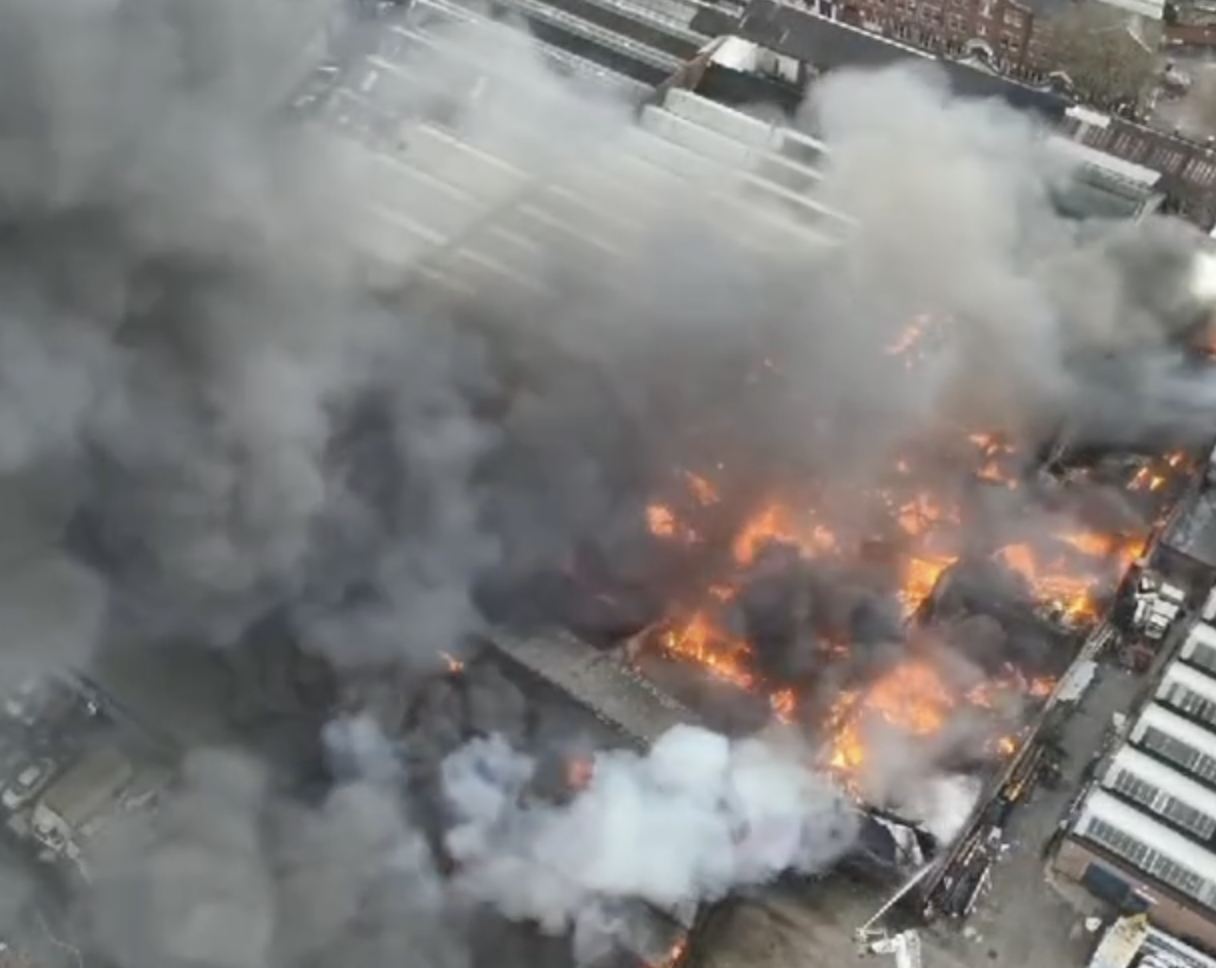 This is a fire in a factory building. Firefighters wearing breathing apparatus are currently tackling the fire.”
