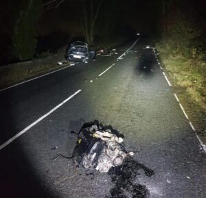 A motorist walked away unscathed after a terrifying high-speed crash near Wigton, Cumbria on Saturday night. The driver lost control, smashing into a tree about 10 feet up the trunk before the car came to rest nearly 50 feet down the road. The impact was so severe that the engine was hurled another 10 to 20 feet away.