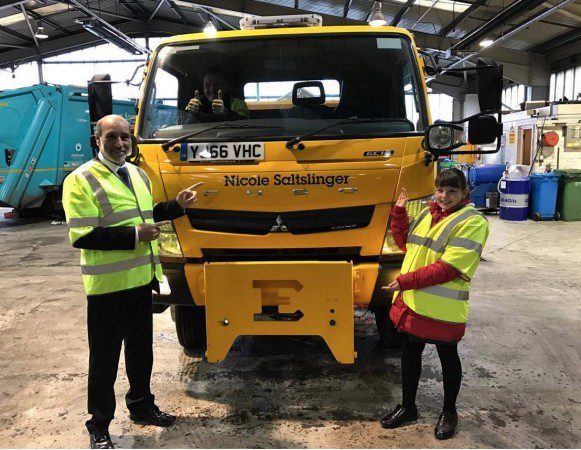 After an avalanche of interest and suggestions Oldham Council can reveal the name of our new gritter is Nicole Saltslinger. Named after the former Pussycat Doll and X-Factor judge Nicole Scherzinger the now famous yellow gritter has become the most famous vehicle in the country over the last few weeks. Recently we asked primary school children from across the borough to ‘prove their salt’ and come up with a fitting name for the new addition to our fleet. After a ‘snow’ start the number of entries snowballed by the day and we eventually ended up with hundreds to choose from, including Gritney Houston, Spready Eddie and even Andy Gritchie, after the former Oldham Athletic favourite. The competition also really caught the imagination of the ‘gritterarati’ and it received wide spread national coverage in newspapers, websites, TV and radio. The winning entry was sent in by Eve McGrath, who attends Royton Hall Primary School. We ploughed through hundreds of entries and Eve was the only youngster who came up with the unique and fun name. The 10-year-old decided on Nicole Saltslinger as she is a fan of the Saturday night entertainment show. Eve made the trip down to our depot at Moorhey Street for a special naming ceremony. Nicole will now join Freddie Salted; Grittersaurus; Goliath; Walter the Salter; Gritterbug; Gritney Spears; Gritanator and Thor, helping to keep the borough’s roads moving safely when the snow and ice appear. Councillor Fida Hussain, Cabinet Member for Environment Services, said: “Firstly we’d like to thank Eve for coming up with such a great name. “We’re delighted with how well the competition took off. It captured the imagination of Oldham residents and the whole nation. It was intended as a bit of fun and we even treated the silly suggestions with a pinch of salt. ‘We ran a similar competition a few years ago which was also really well received but this time I think we’ve taken it up a notch. “On a single tweet more than 70,000 people engaged with us in one way or another and some of the suggestions we had were fantastic. “In Oldham we’re usually hit quite hard when the snow begins to fall and we have an excellent team who work tirelessly to keep the roads clear and the borough moving. “Our gritters obviously play a vital role in that and so it’s nice that we can have a bit of fun by running competitions like this whilst teaching young people about road safety.”
