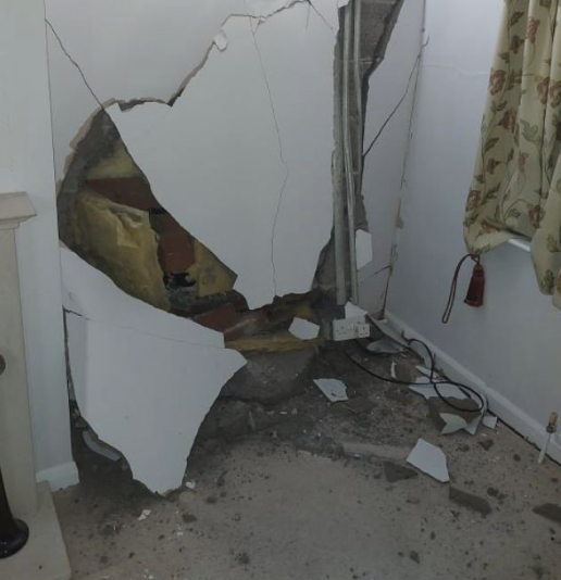 The collision left brickwork smashed inwards, twisted, and with exposed electrical wires, rendering the house unsafe. The family was forced into emergency accommodation while repairs costing nearly £20,000 took over five months to complete.