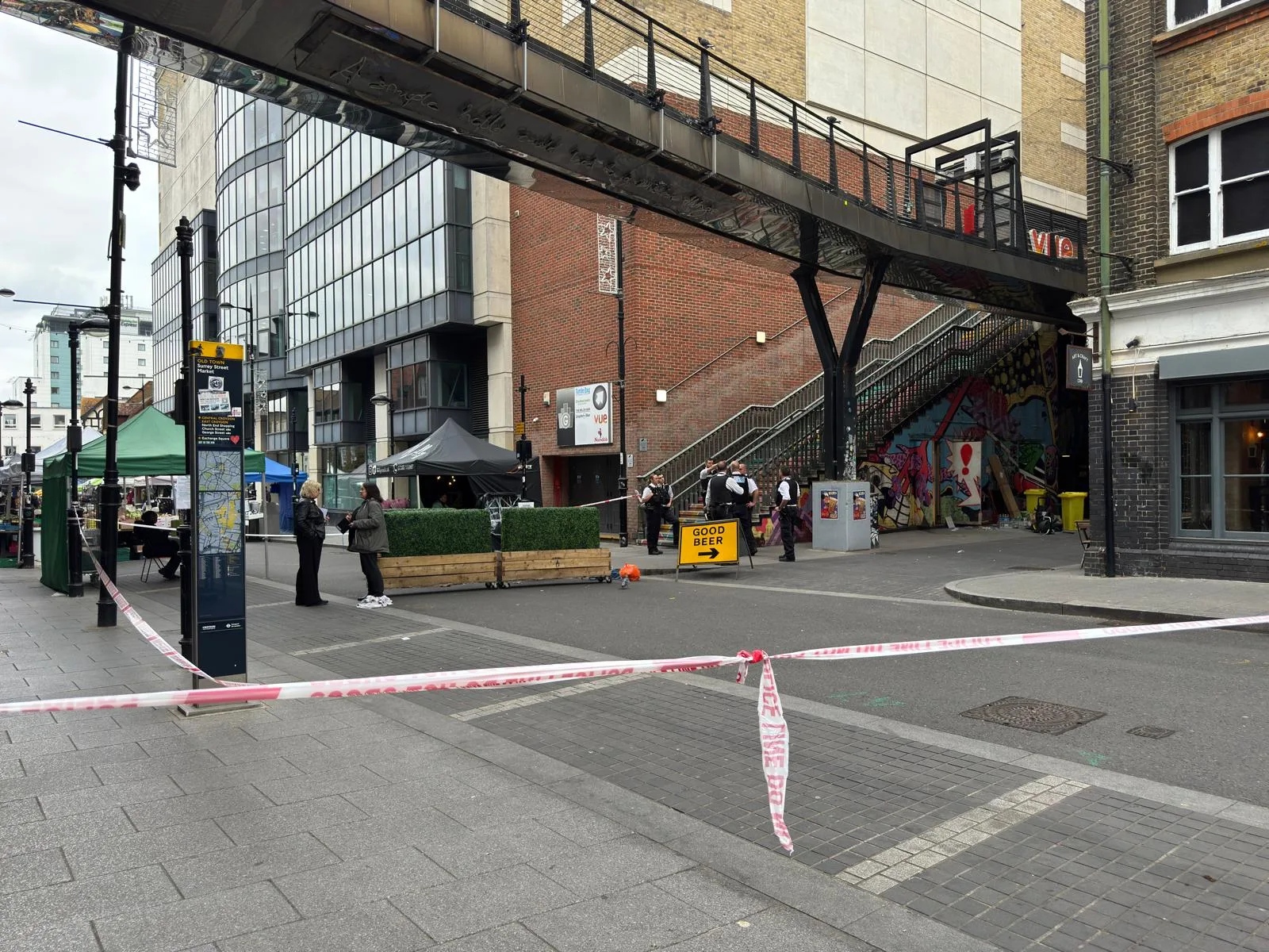 A dramatic emergency unfolded on Surrey Street today when a man fell from the pedestrian walkway towering over the bustling street market. It happened right in the middle of a busy Friday lunchtime, causing chaos and panic.