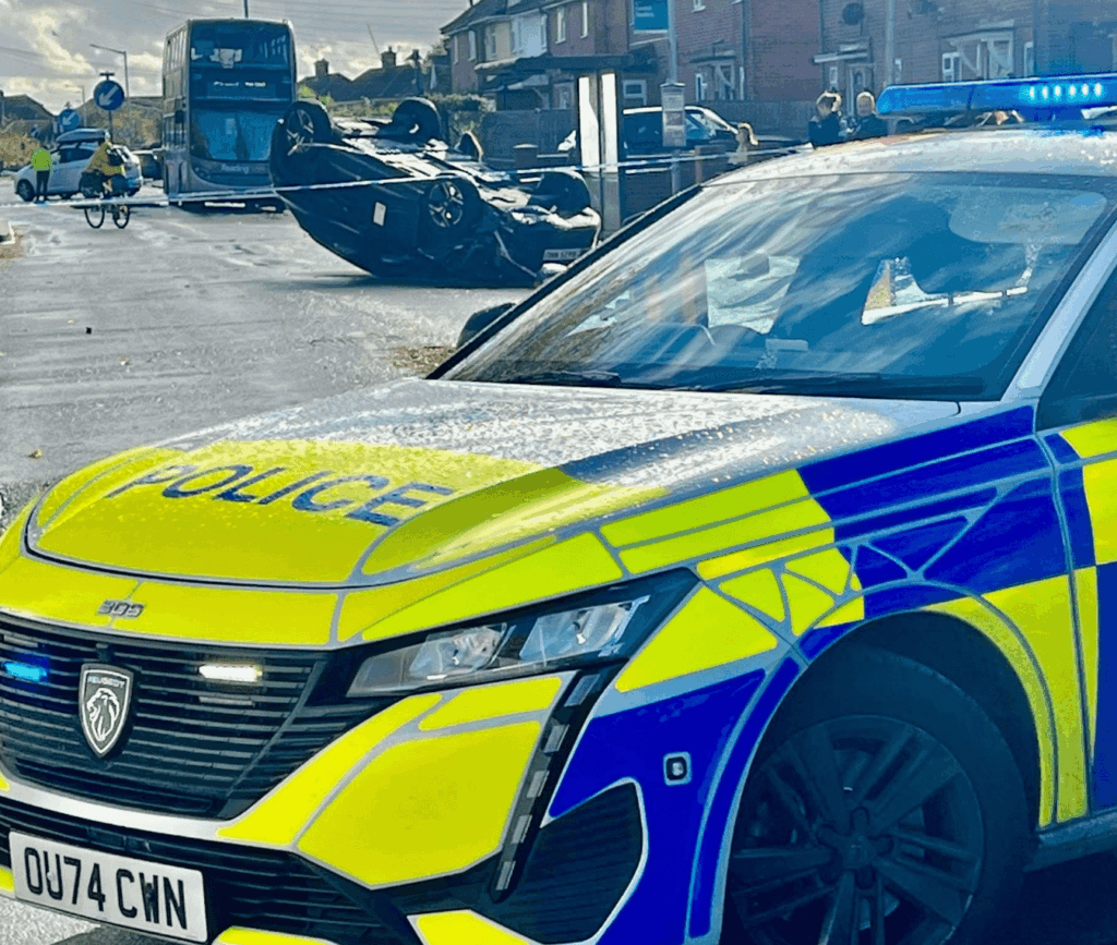 A car crash in South Reading has caused major disruption this Friday afternoon. The smash happened on Northumberland Avenue in Whitley when a car slammed into a bus shelter and flipped onto its side.