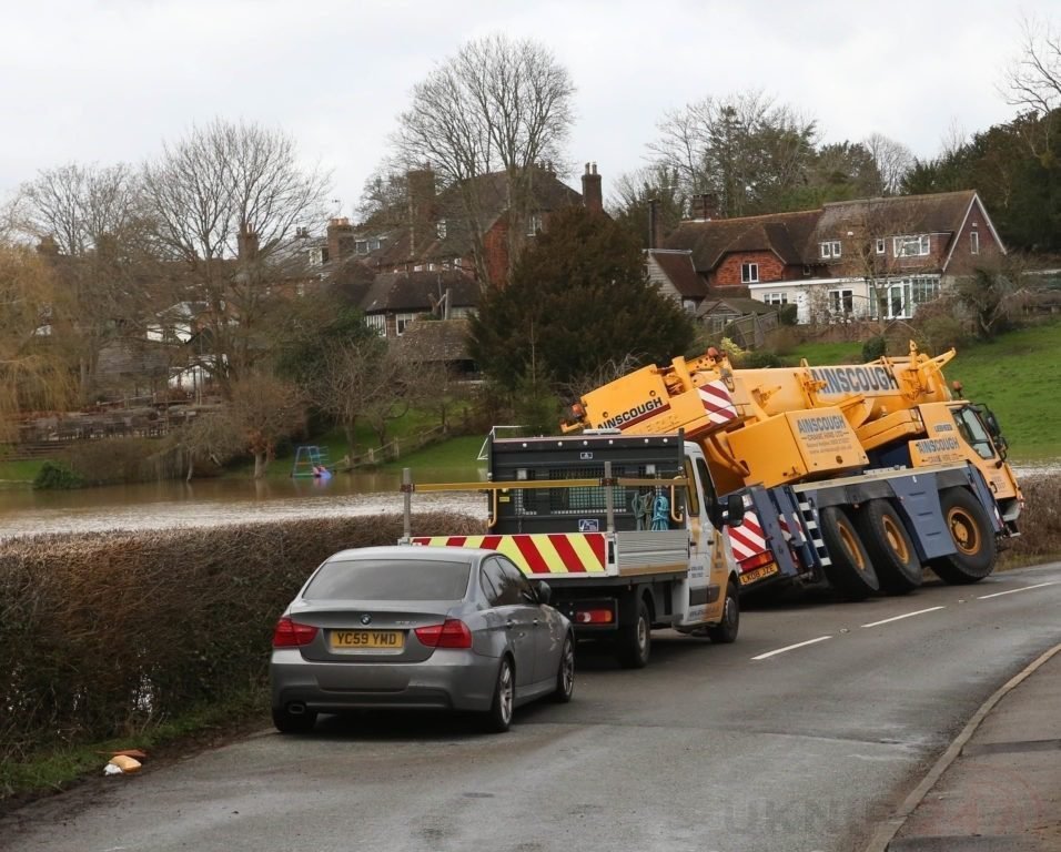 The Big Yellow beast was trying to pass a number of vehicle that had been abandoned after getting stuck in flood water on the road over night. Police had to arrange for one vehicle to be recovered after the driver refused to come and move the white AMG Mercedes. Two specialist recovery cranes have called in with powerful winches to carry out the recovery that is going to take some time. https:///youtu.be/v0hjvvbqSQs Police say the road is remain closed for the next few hours. Full Recovery: https:///youtu.be/hBBpIUT2-qU