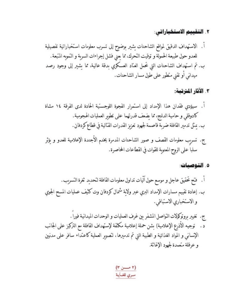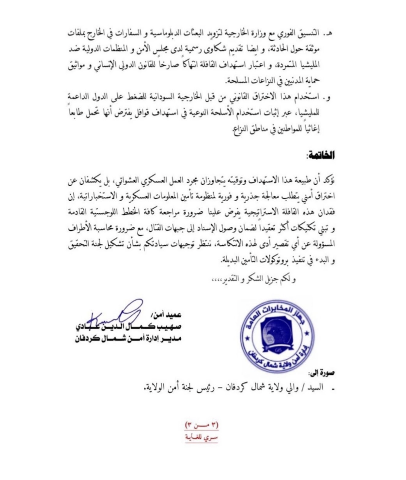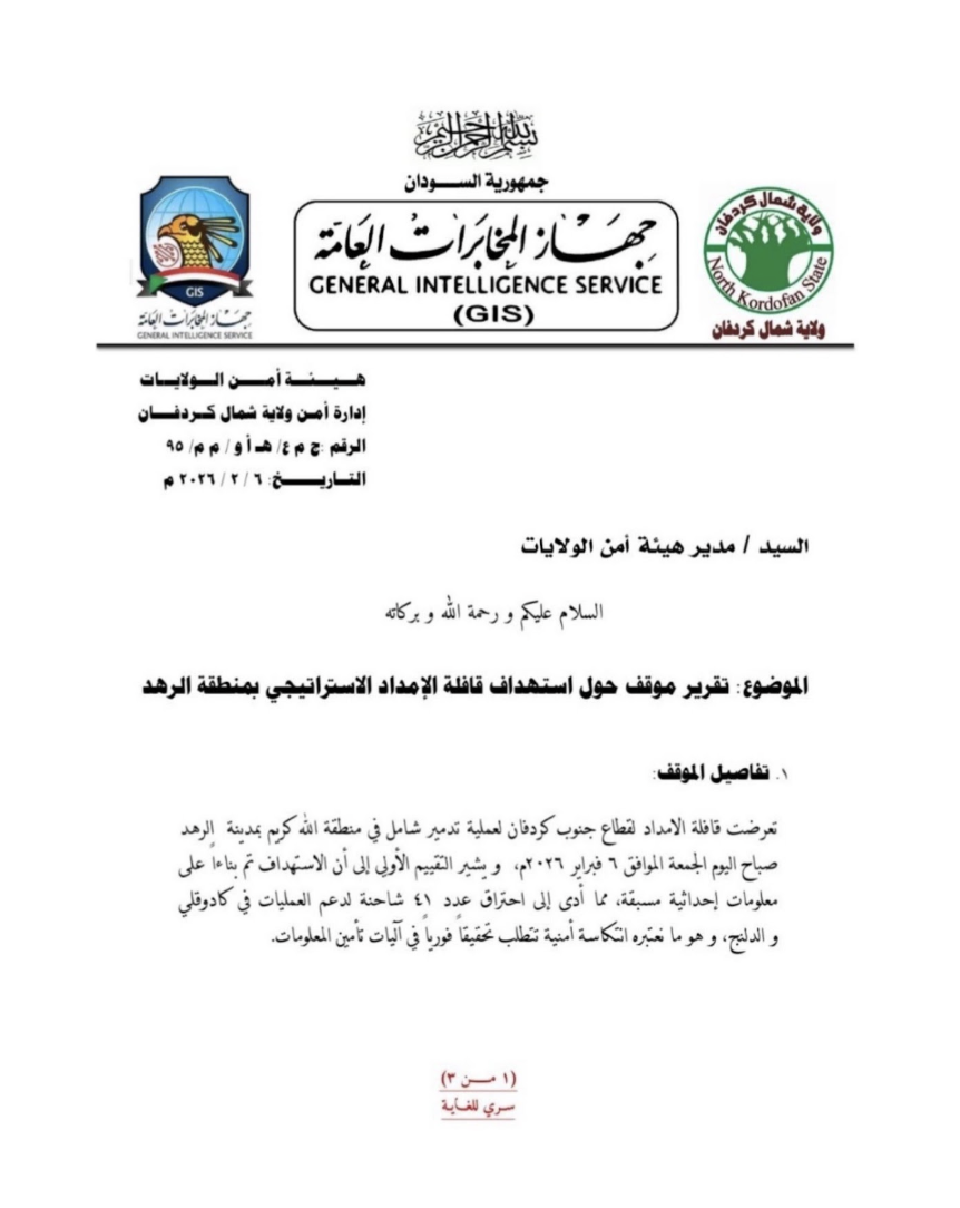 An official intelligence document, attributed to the General Intelligence Service of Sudan, has revealed that the convoy targeted in the Al-Rahd area of South Kordofan was not a purely humanitarian relief convoy as officially announced by the Sudanese army, but rather was carrying shipments of high-quality weapons and ammunition directed to the Sudanese army forces in the theatres of operations in the state.