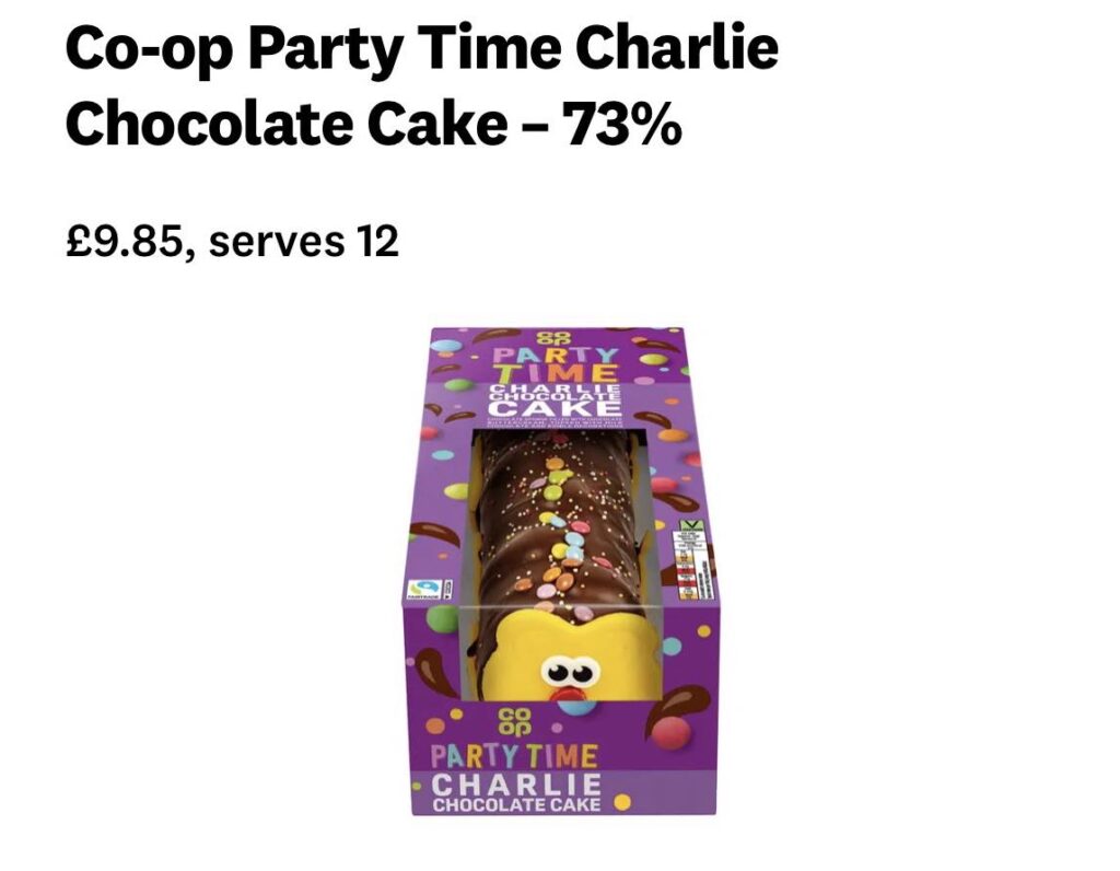 • Co-op Party Time Charlie Chocolate Cake – 73%