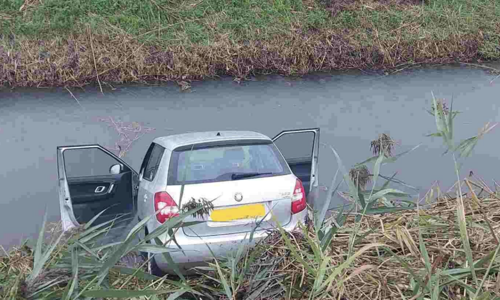 Police rushed to the scene after a car slid off the road in Rye and ended up partially submerged in shallow water. The vehicle took an “unexpected detour” after sliding on a wet grass verge.