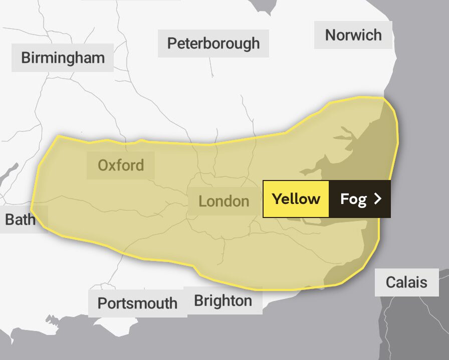 Yellow weather warnings have been put in place across parts of the South East and London overnight are covered with heavy fog blankets. The severe fog warnings were issued across eastern, southeastern and southwestern parts of the country overnight. The Met Office has advised motorists to be extra careful across much of the east amid thick fog and mist. Warnings, which were put in place from 3am, will run until 10am and could cause major traffic delays.