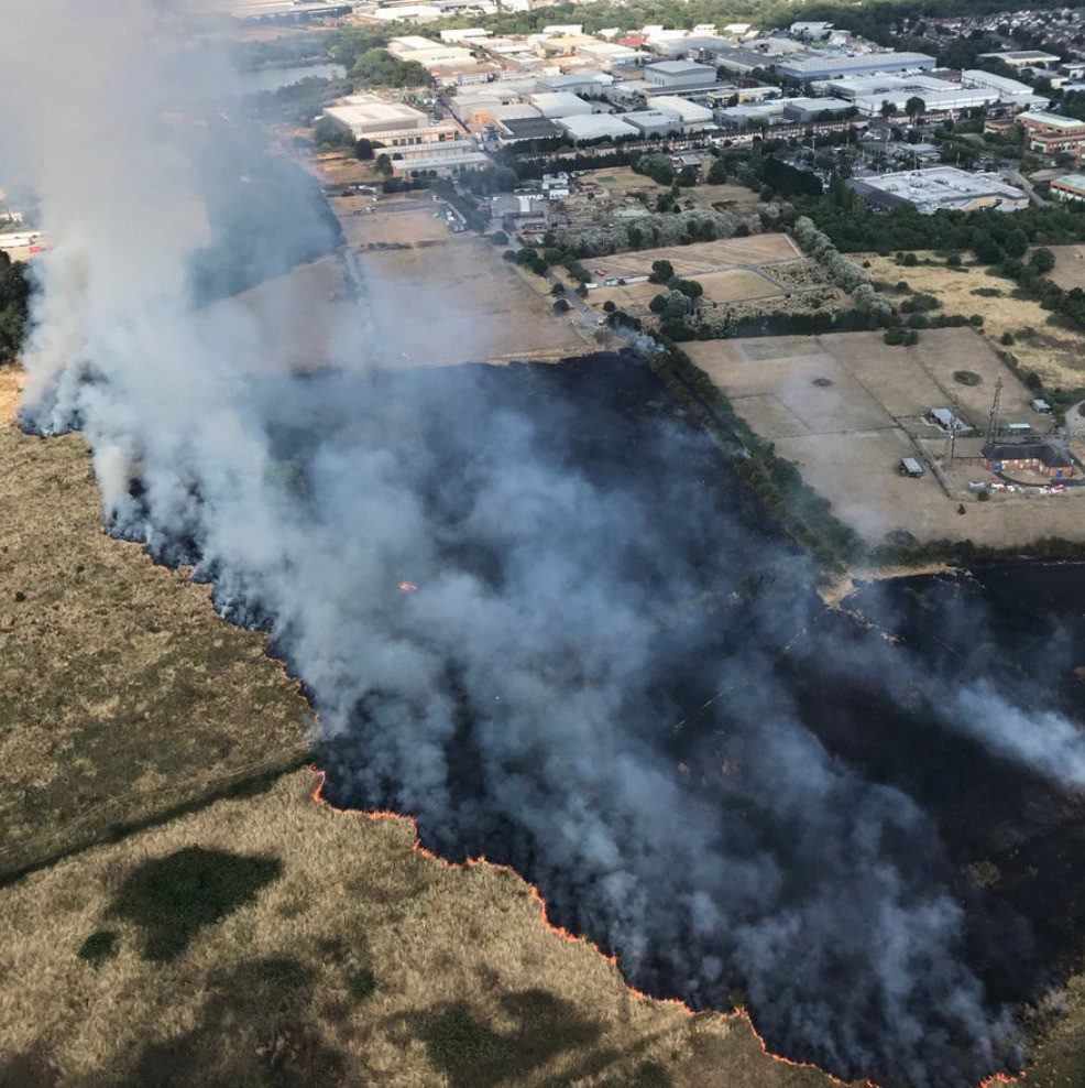 Fifteen fire engines and 97 firefighters and officers are dealing with a grass fire on Staines Road in Feltham. Grass land the size of four football pitches is alight. Smoke from the fire has travelled near to Heathrow airport but it is not affecting their operations. Fourteen horses were removed from a nearby field to a place of safety. The number of resources are there to help with water relay. The Brigade was called at just before 4pm on Saturday afternoon. Firefighters from 1 and surrounding stations are at the scene. The cause of the 1 is not known at this stage. Pic:NPAS