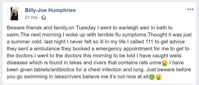 A man says he’s caught a disease after swimming at Warleigh Weir in Somerset. The weir, located in Claverton, just a couple of miles from the Wiltshire border, is popular with tourists and locals who fancy a dip during the warmer summer months. But one man, Billy-Joe Humphries, claims to have contracted Weil’s disease, which the NHS says is caught from urine of infected animals â most commonly rats, mice, cows, pigs and 1. The NHS website states that you can catch it if “soil or freshwater (such as from a river, canal or lake) containing infected pee gets in your mouth, eyes or a cut â usually during activities like kayaking, outdoor swimming or fishing”. Posting on Facebook, Mr Humphries warned the public about his experience. Mr Humphries’ 1 post Anyone with any concerns about their health following a swim at Warleigh Weir, or any other water attraction of a similar nature, should contact their doctor or call 111 for advice.