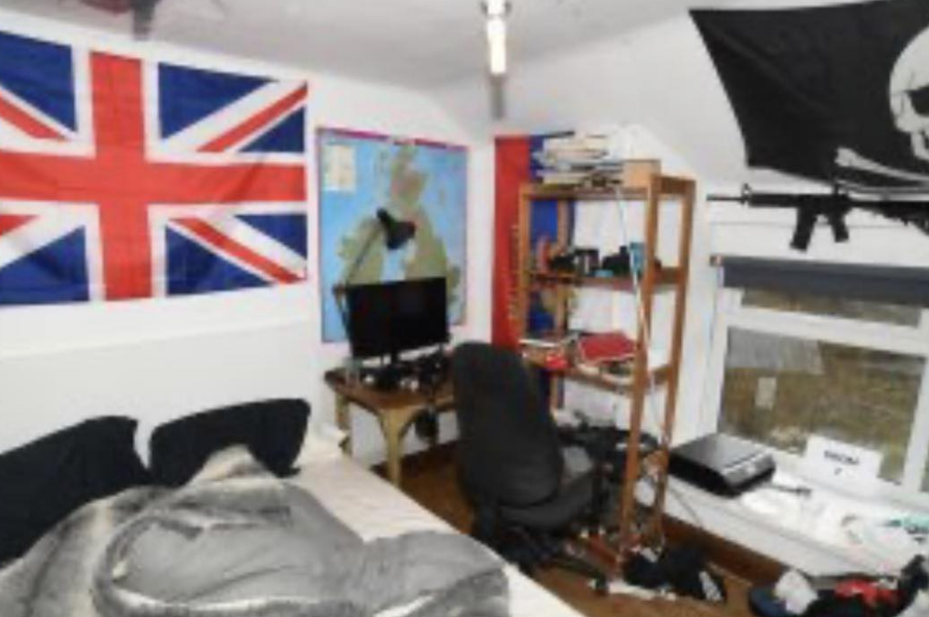 Police searches uncovered a worrying arsenal at his home, including knives, a crossbow, airsoft rifles, body armour, masks, extremist flags, and bomb-making parts.