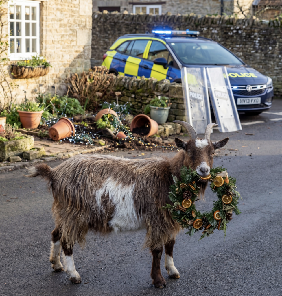 The stubborn goat charged through gardens, chased a local woman, and cheekily helped himself to the oranges off her Christmas wreath. Neighbours had had enough and called 999, reporting the furry troublemaker’s orange-stealing antics.