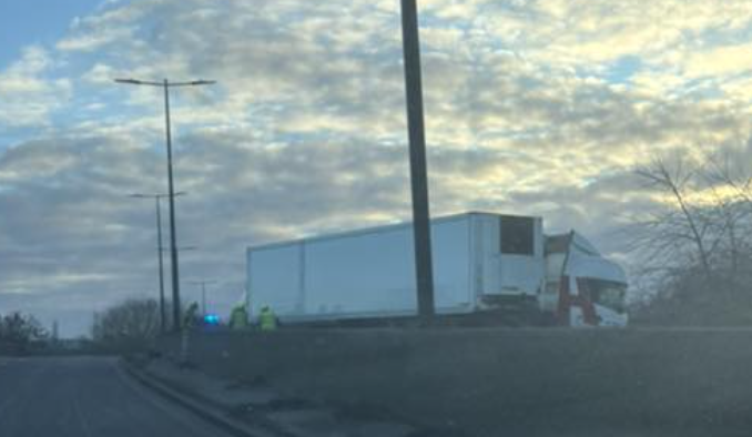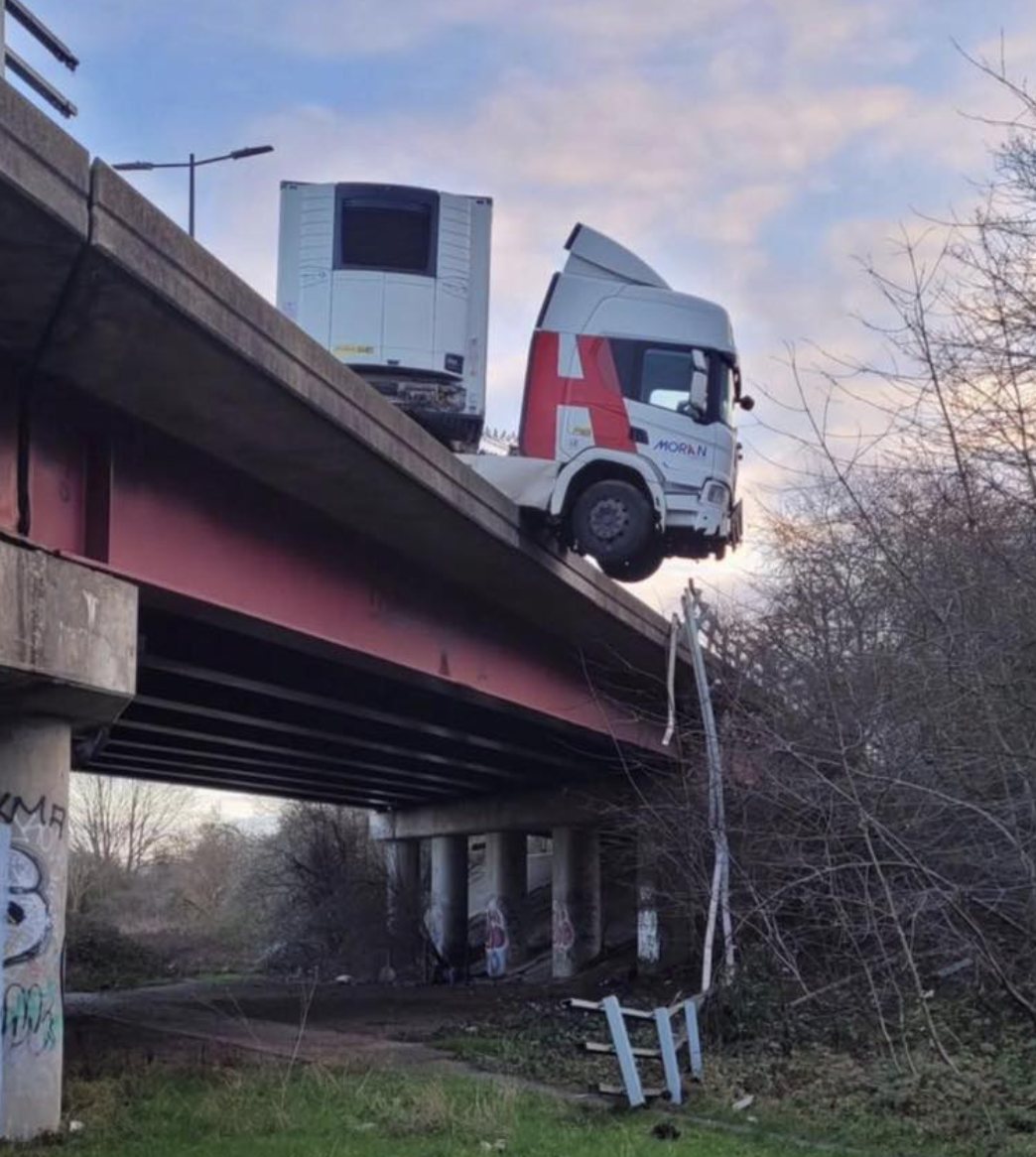 Local eyewitnesses report a lorry has smashed through barriers and is now hanging dangerously off the edge — seemingly after skidding on black ice. “Lorry gone over the barriers,” confirmed one bystander, Molly Sales, adding that the vehicle appears to be “hanging over the edge, skidded on ice apparently.”