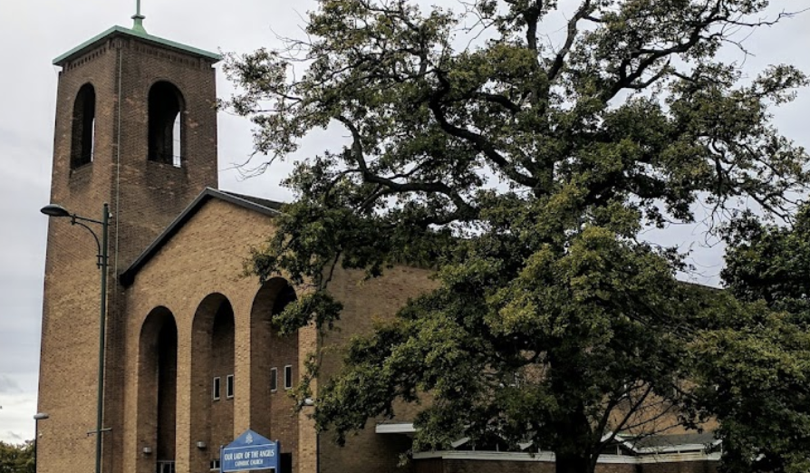 Witnesses reported spotting a forensic tent in the churchyard of Our Lady of the Angels, with police tape cordoning off the area. The scene remains under investigation as authorities gather evidence.